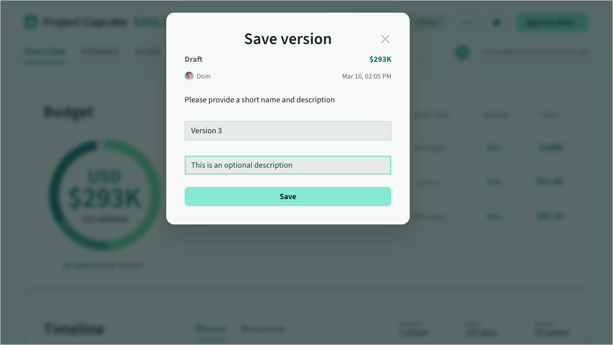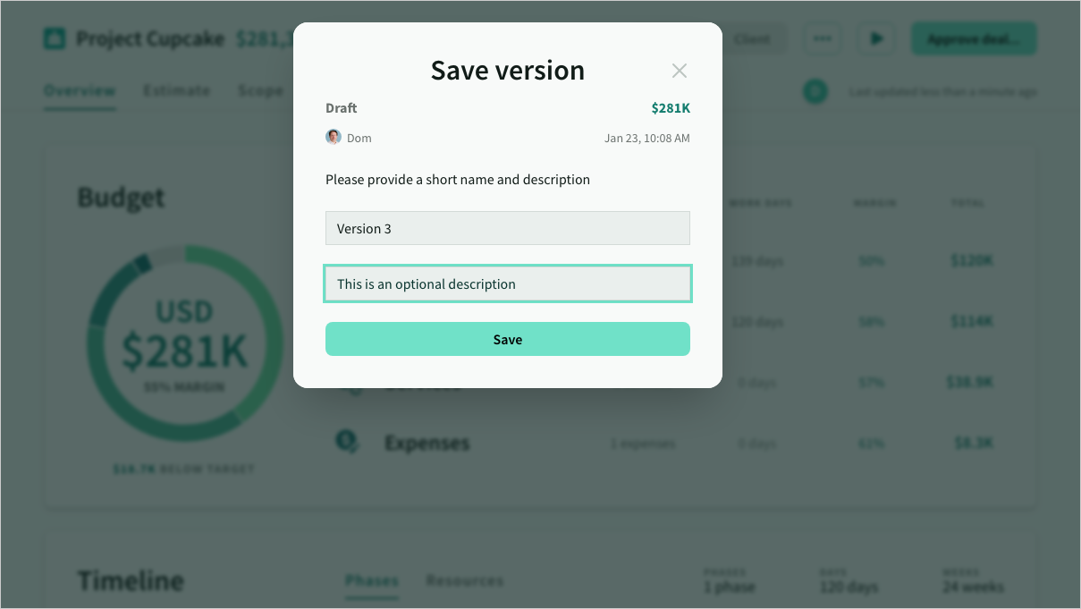 When you create (or edit) a version, you can set a name and optional description. Automatic versions are named after the deal status.