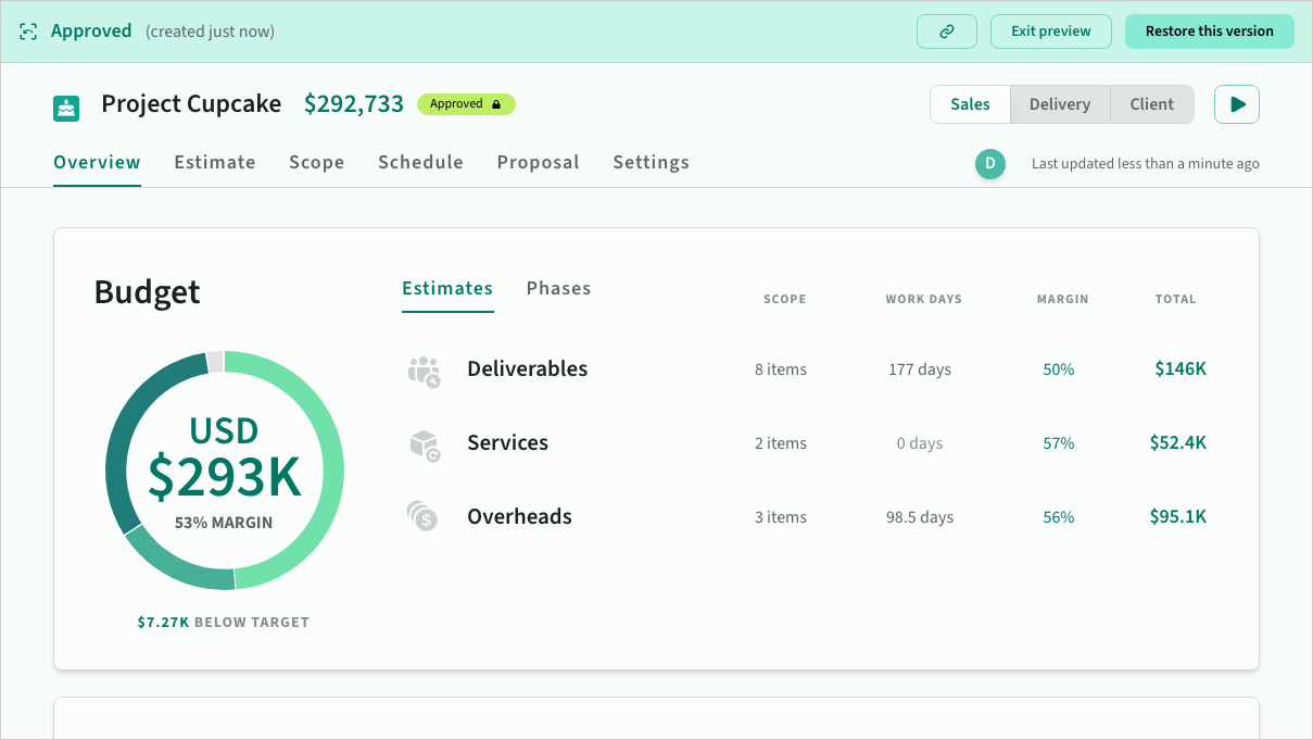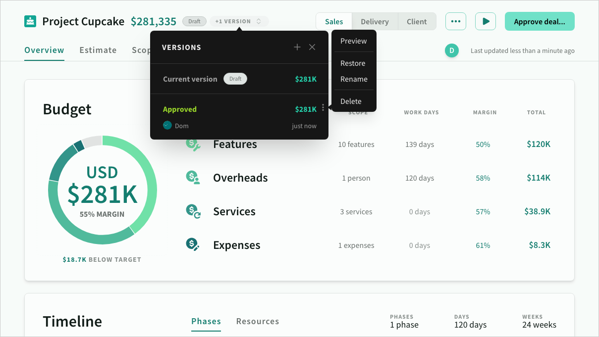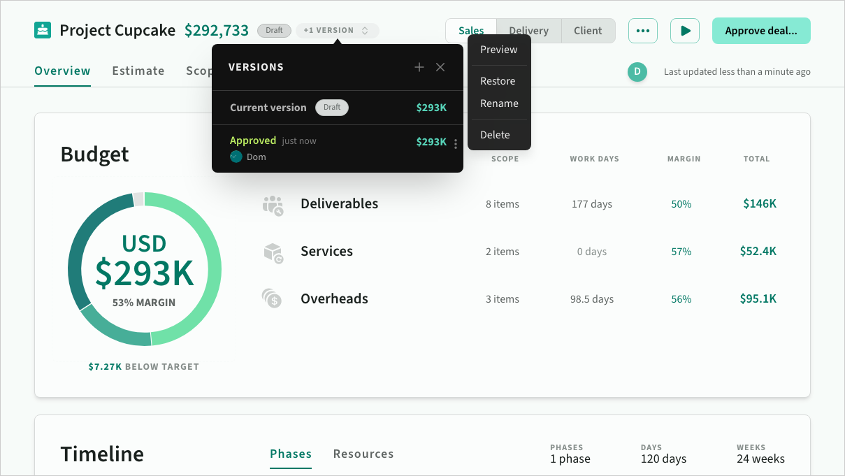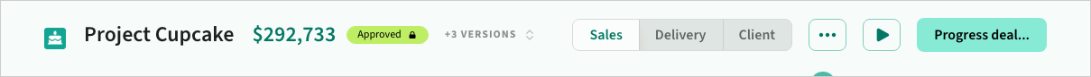 Access versions from the … menu on the deal page, or via the versions button that appears next to the status in the deal header when there are multiple versions available.