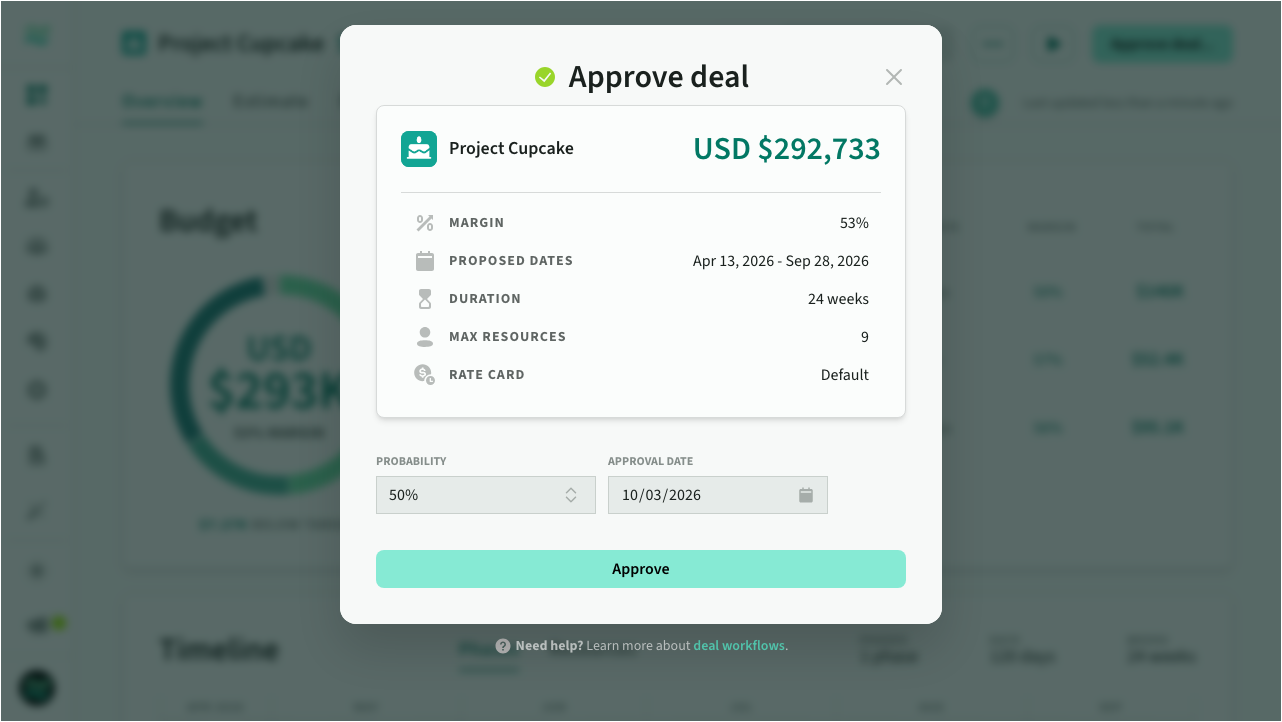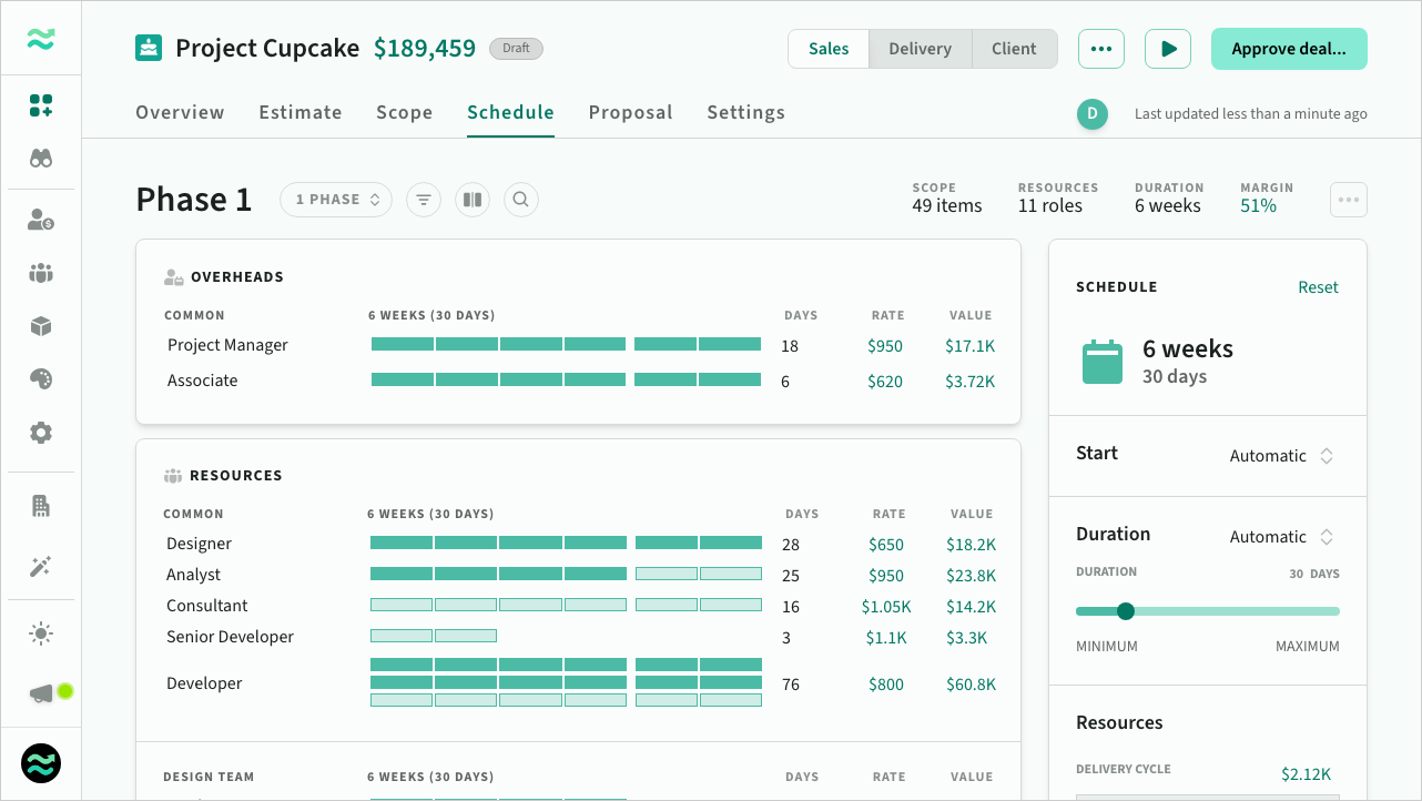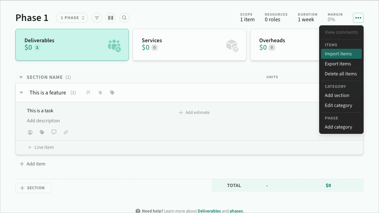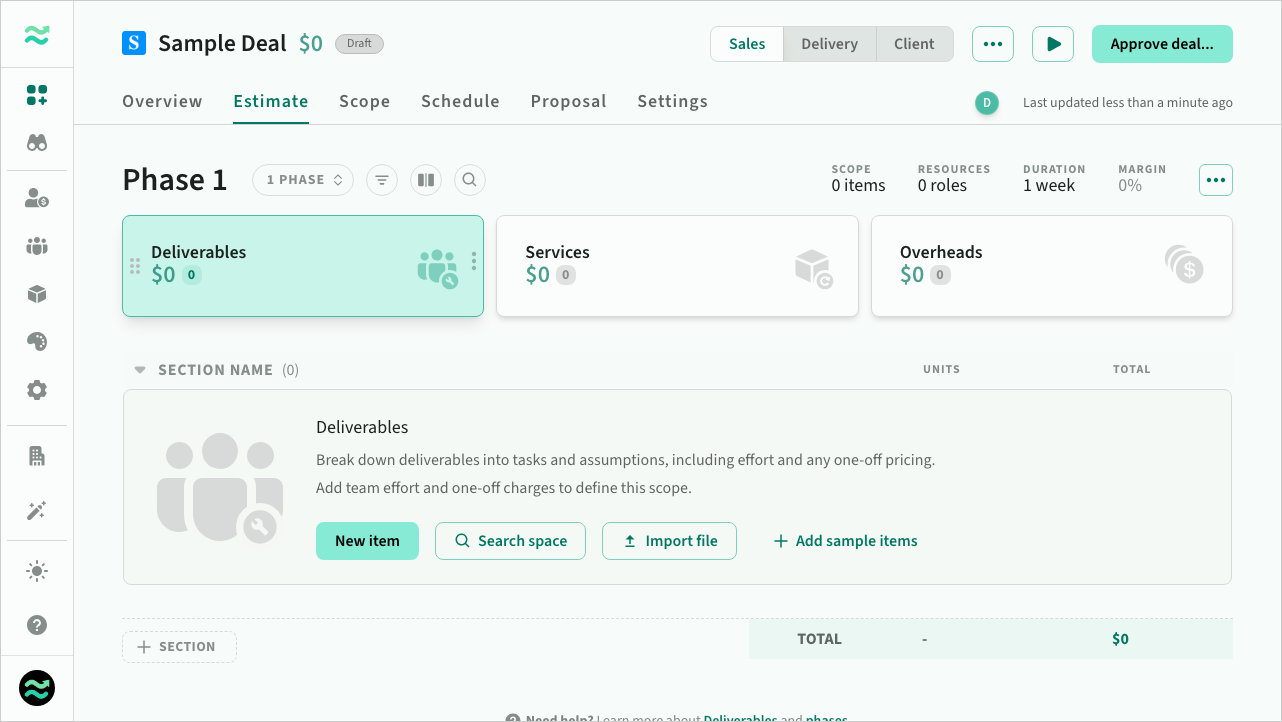 - Estimation - populating the deal with raw estimates and requirements (as items and line items within phases)
