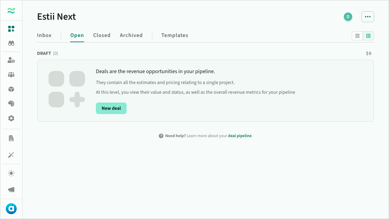To launch the New deal setup dialogue, navigate to the pipeline and click New deal.
