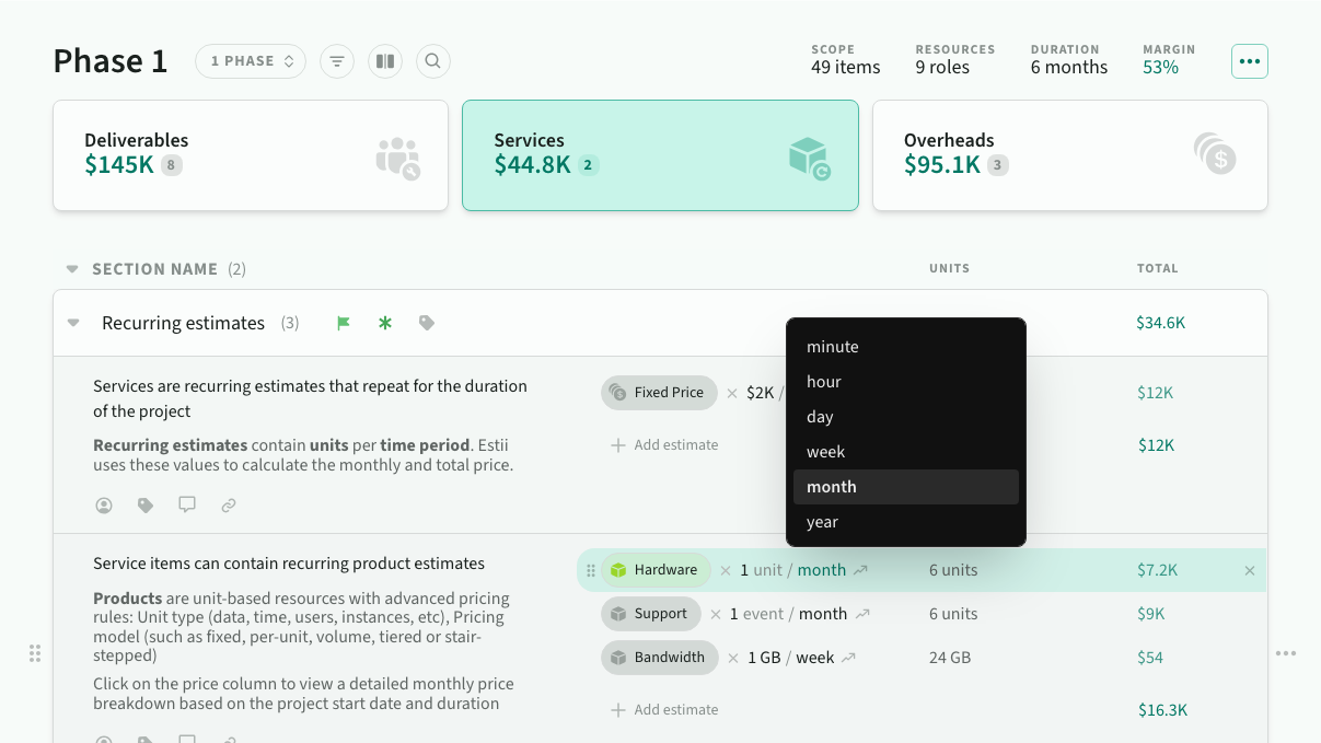Recurring estimates repeat for the duration of the phase and automatically adjust as the schedule changes. Use recurring pricing for ongoing allocations, subscriptions, or managed services.