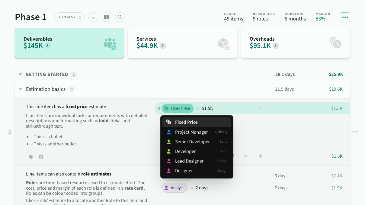 One-off estimates are calculated once and contribute a fixed amount to the phase total. Use one-off pricing for deliverables, setup costs, hardware, or any work that happens once regardless of phase duration.