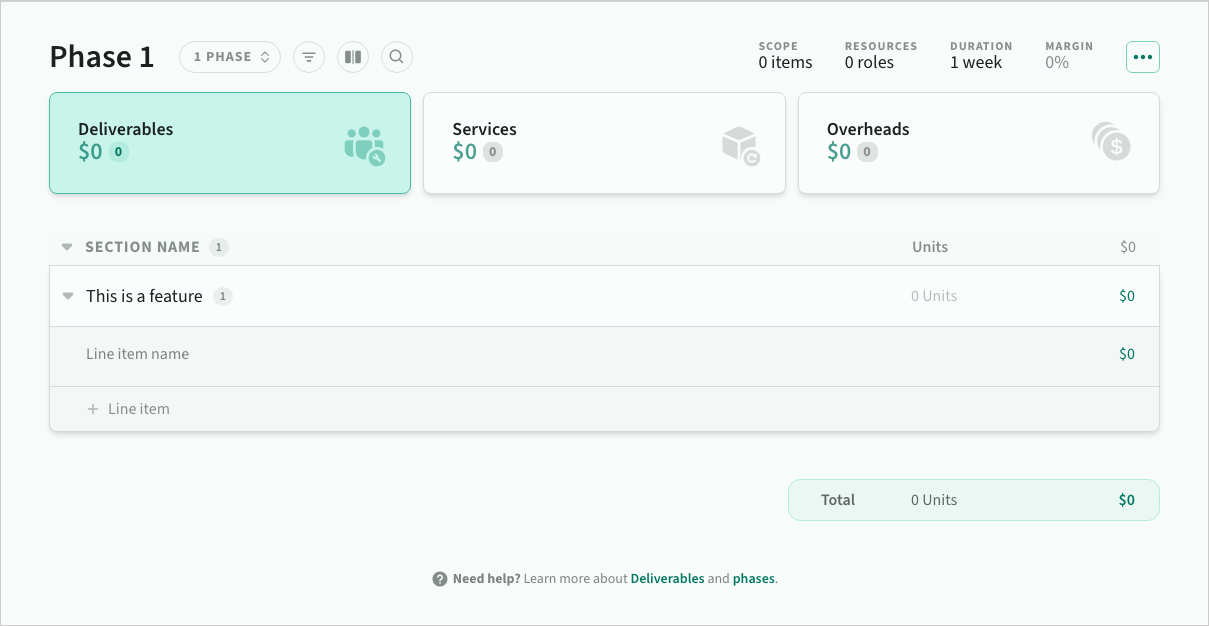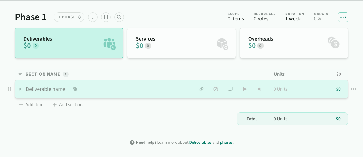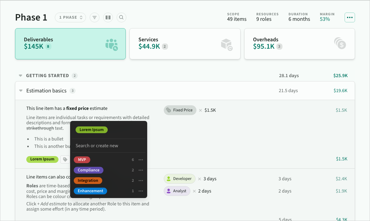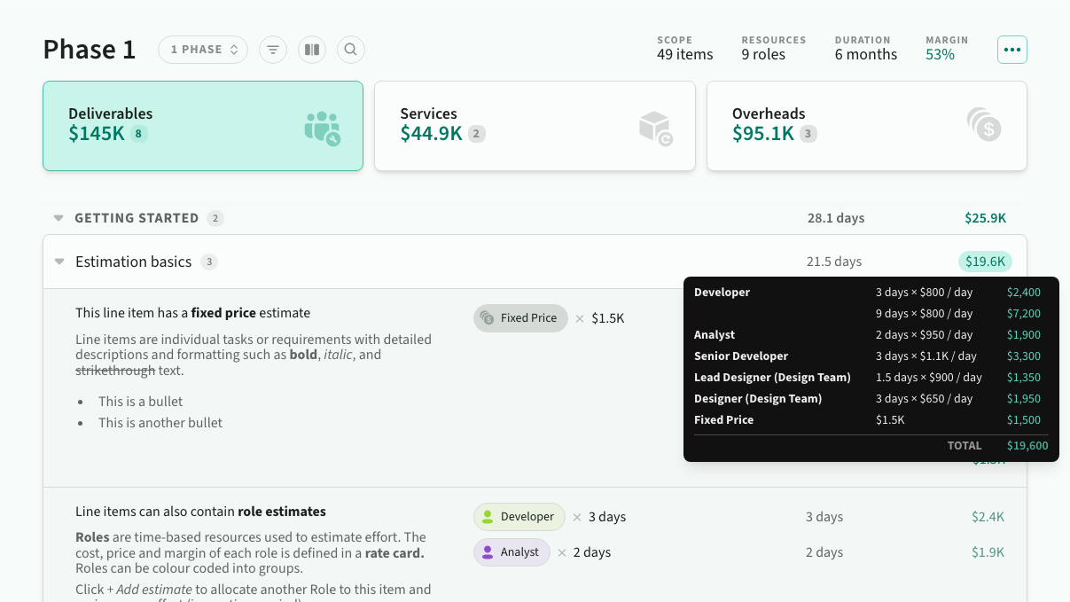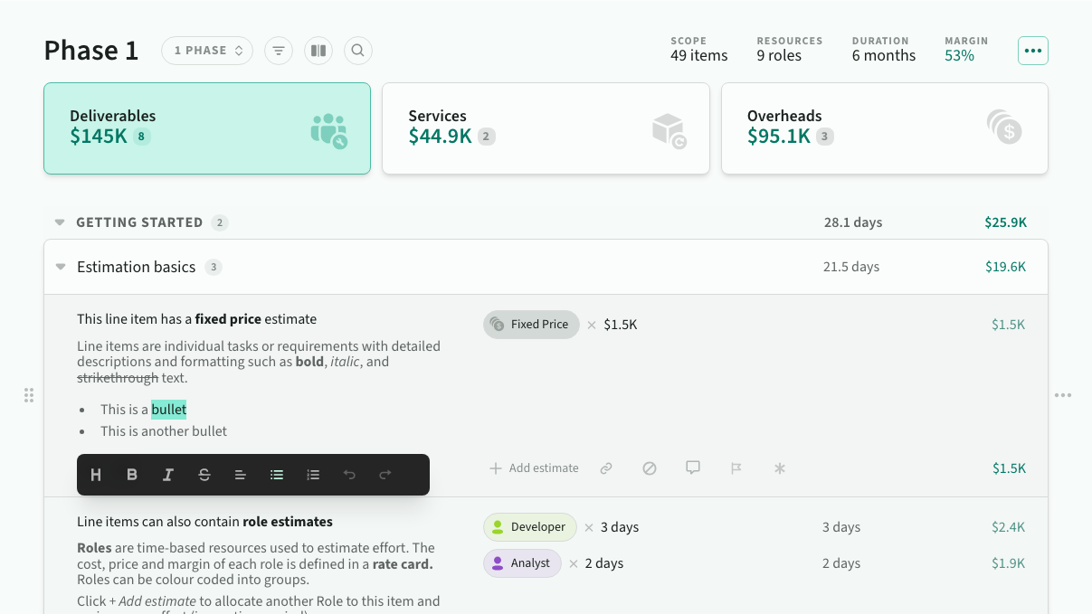 Estimates are the building blocks of deal pricing. Each phase contains categories of items, line items and estimates that together determine the effort and cost of your deal.