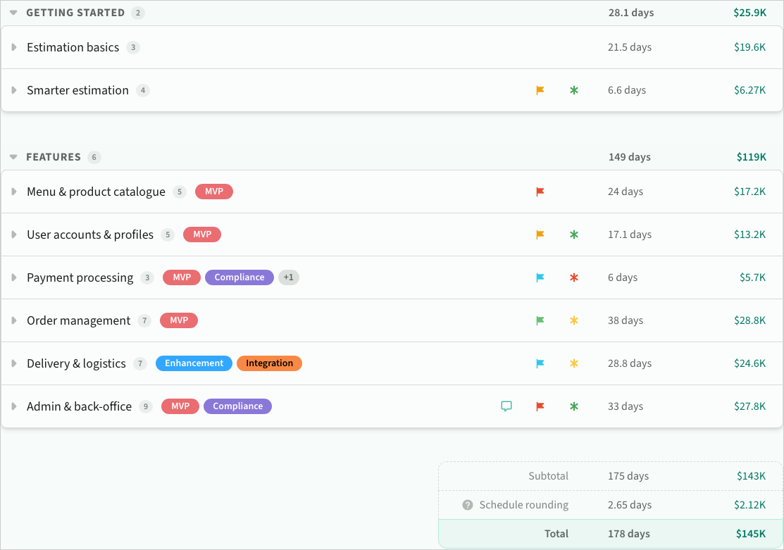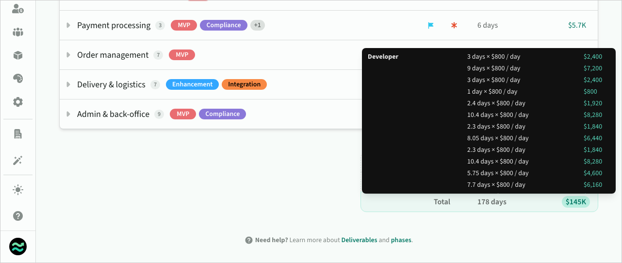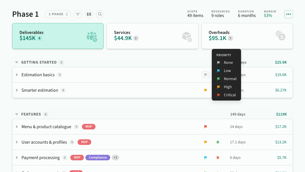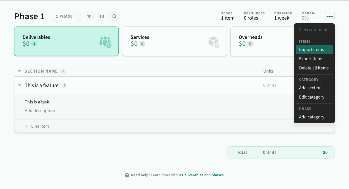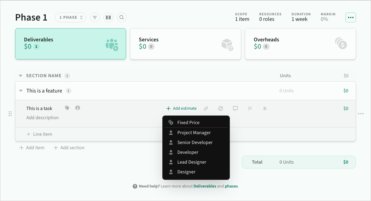 Estimates are the building blocks of deal pricing. Each phase contains categories of items, line items and estimates that together determine the effort and cost of your deal.