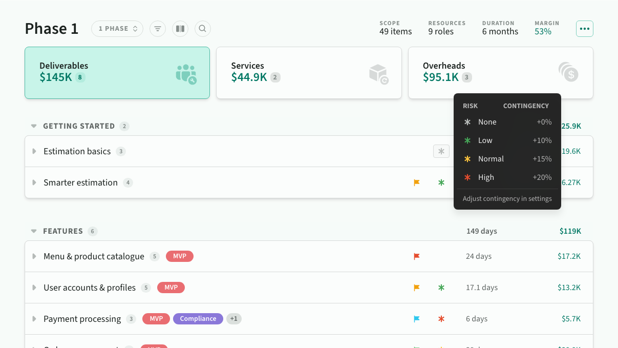 Every item has a risk level that can be set to low, medium or high or none. Contingency is automatically applied to all estimates inside the item.