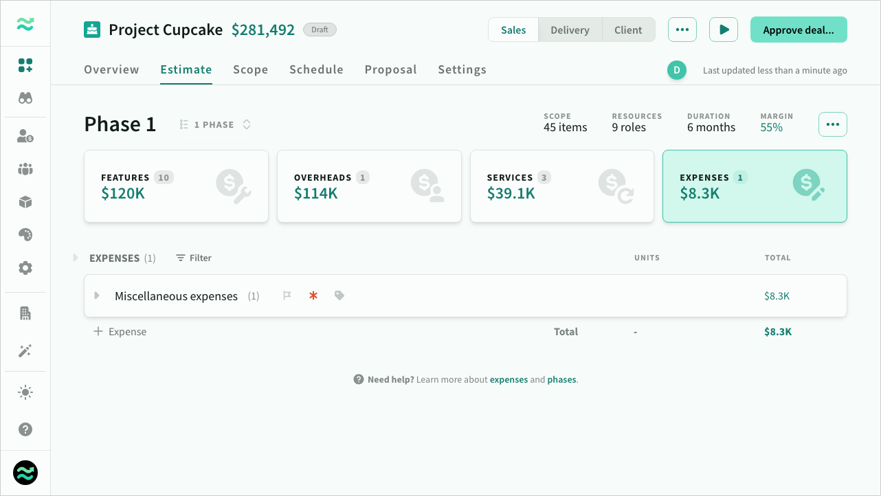 Expenses are similar to services, but without the recurring pricing. You can estimate using fixed price or product resources, and a total units (if applicable).