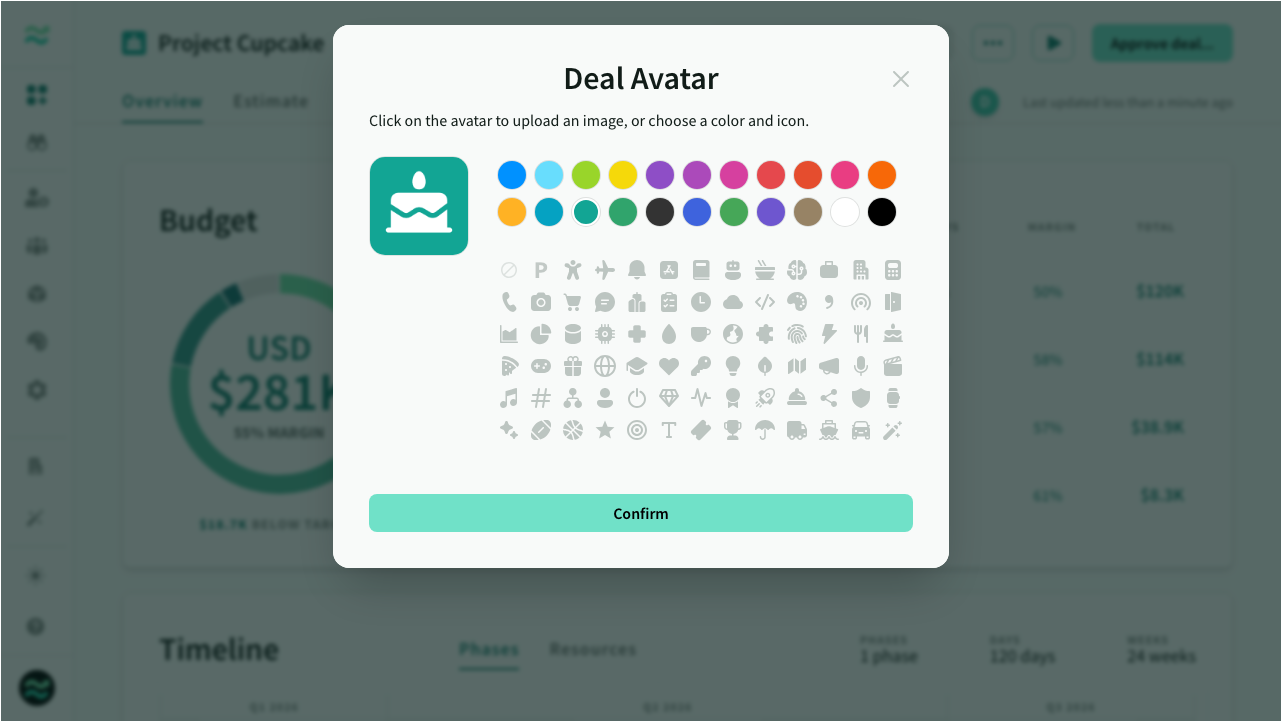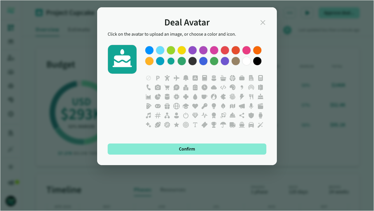 You can change the deal avatar by clicking on the icon in the header and either uploading an image, or selecting a colour and icon.