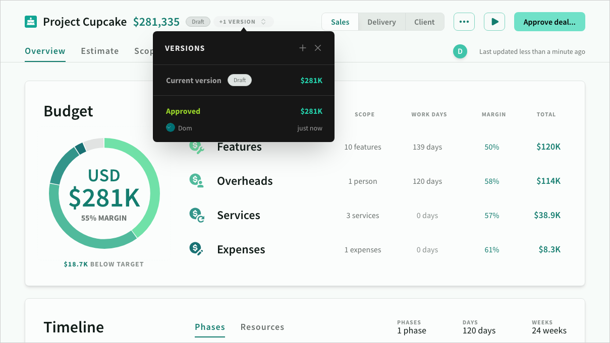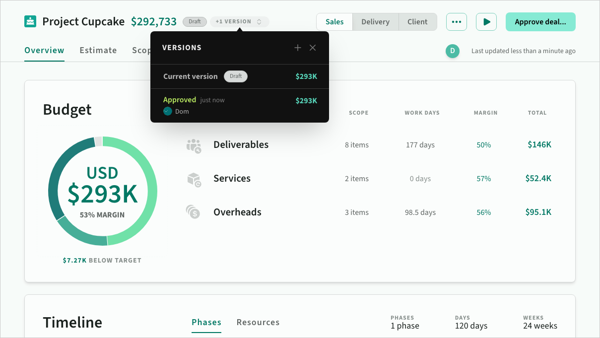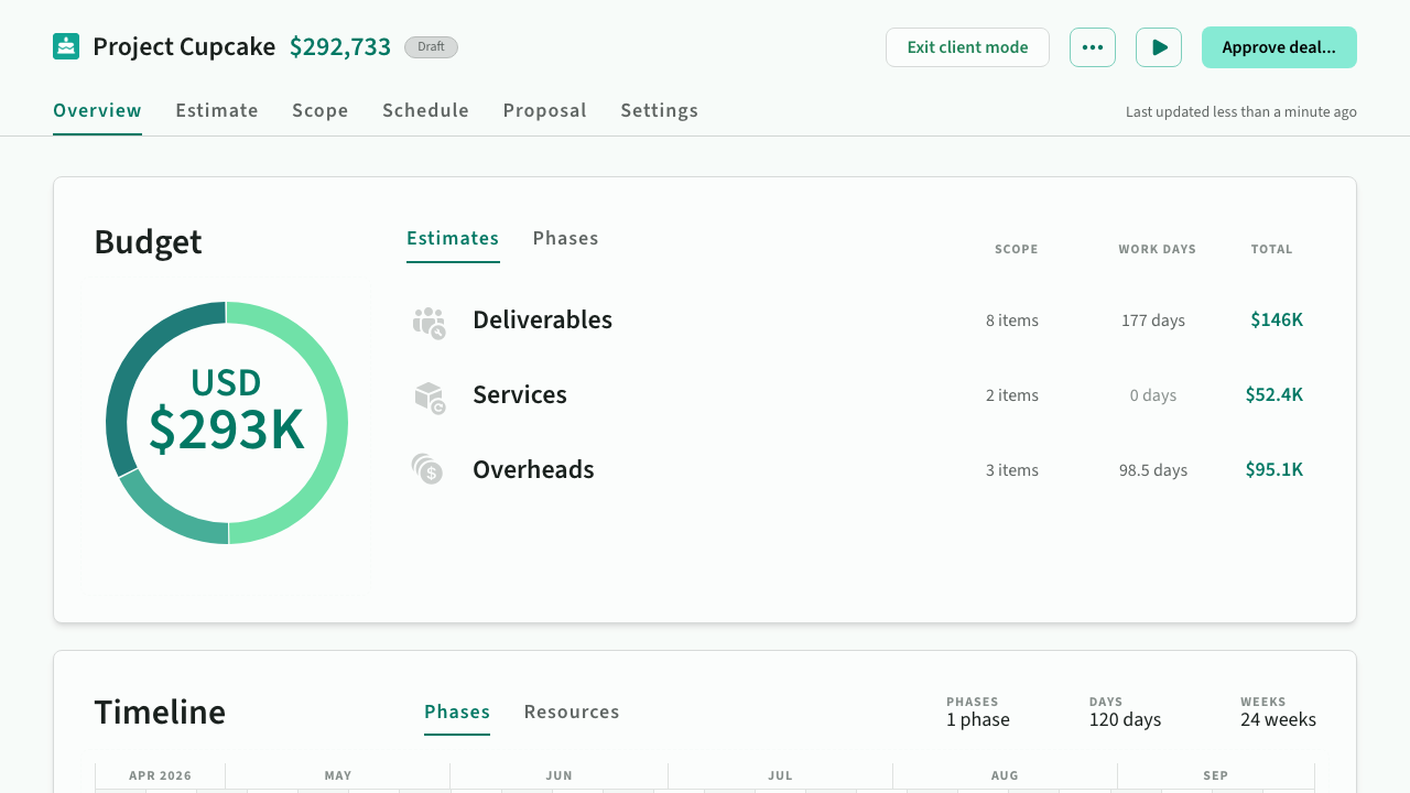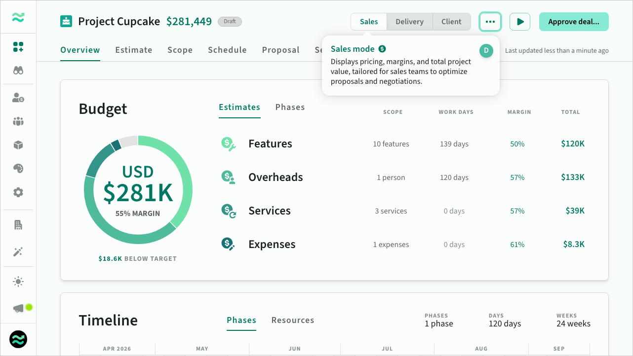 Tailored for sales teams, this mode shows pricing, margins, and the total value of projects to help optimise proposals and negotiations.