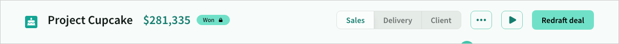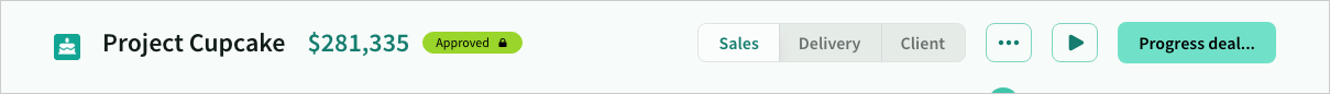 The deal header provides a snapshot of the current value and status, along with the the primary action to progress to the next stage.