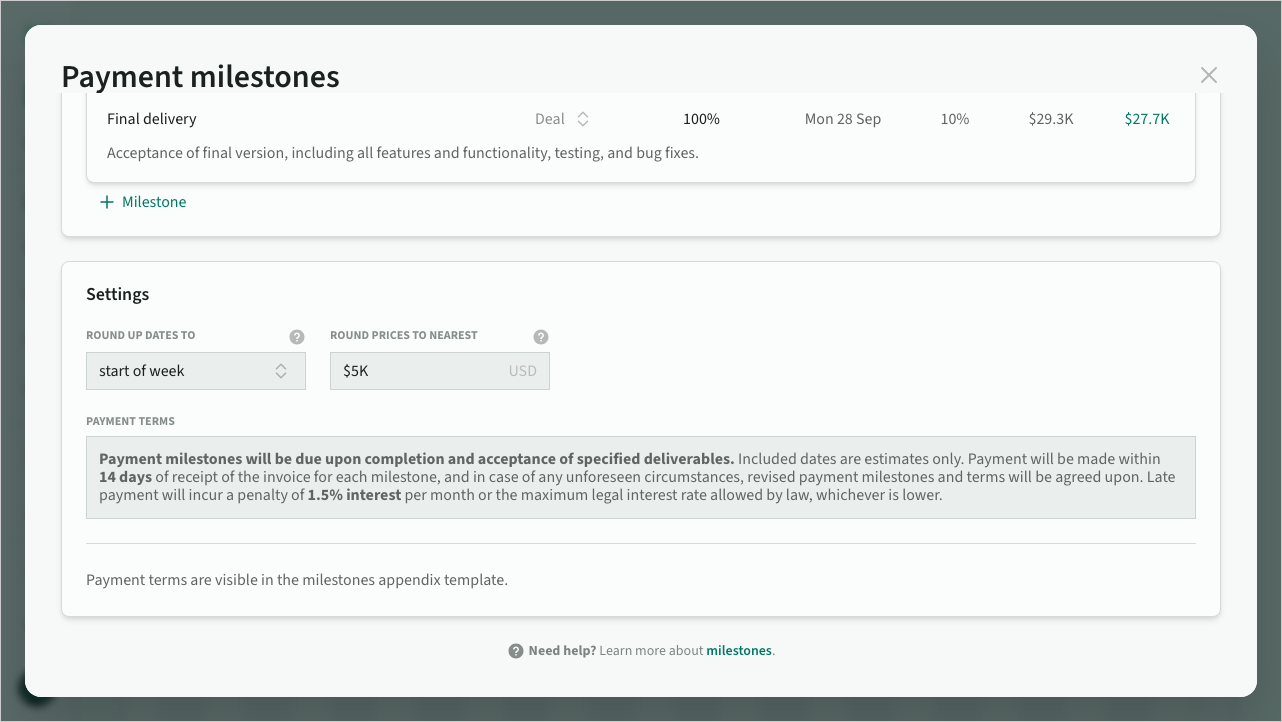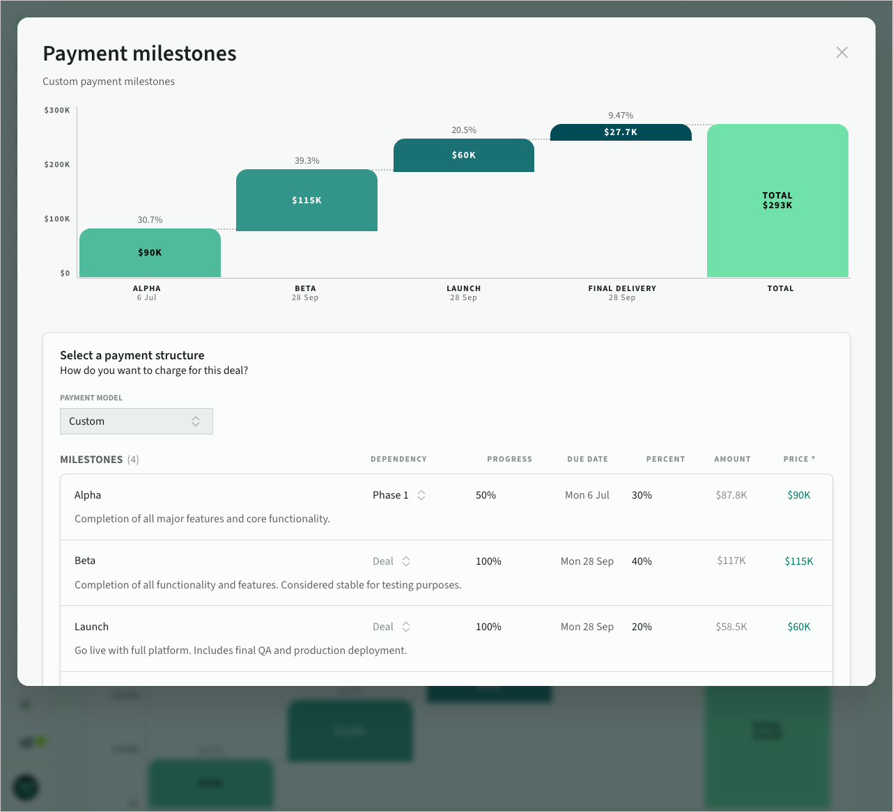 Payment milestones outline the payment structure for a deal, based on progress, deliverables, dates, and pricing.