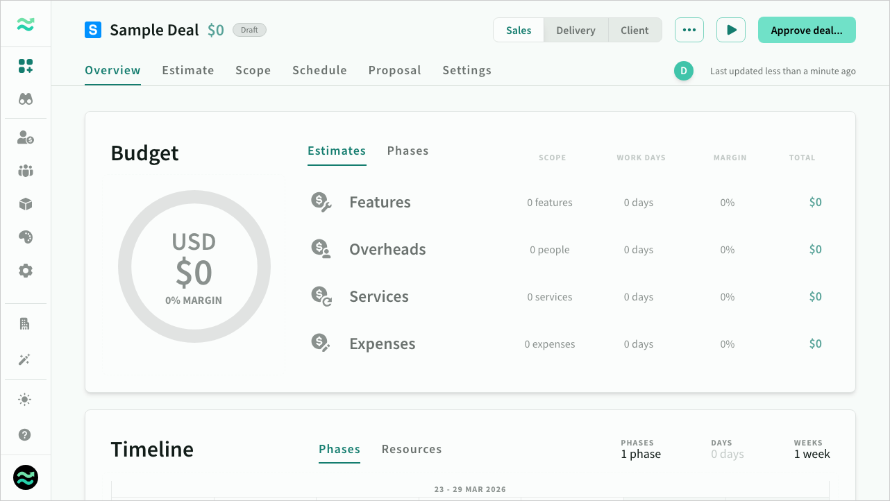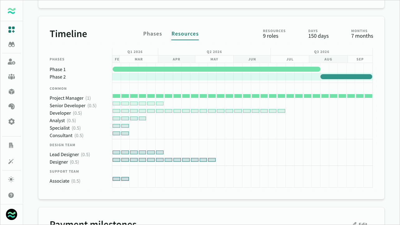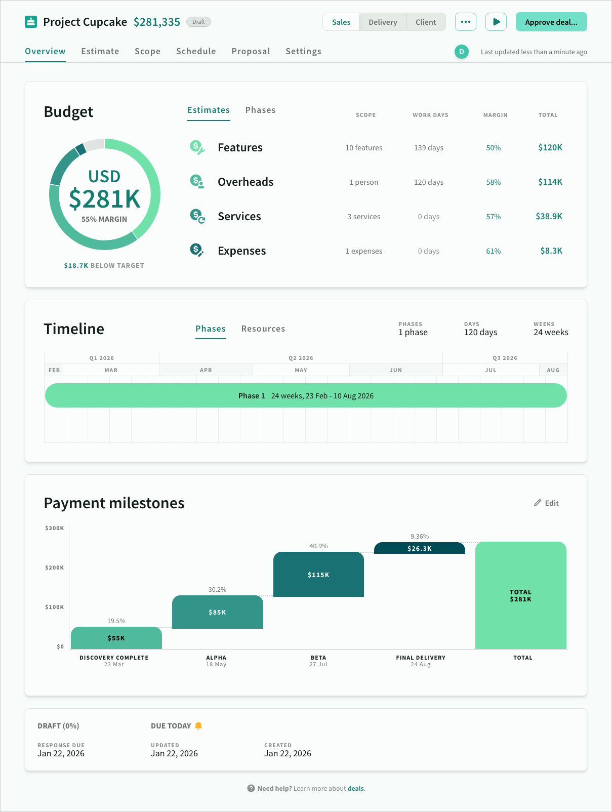 Payment milestones describe your expected payment structure based on deliverables, due dates and price. They are visualised as a waterfall chart in exported proposals