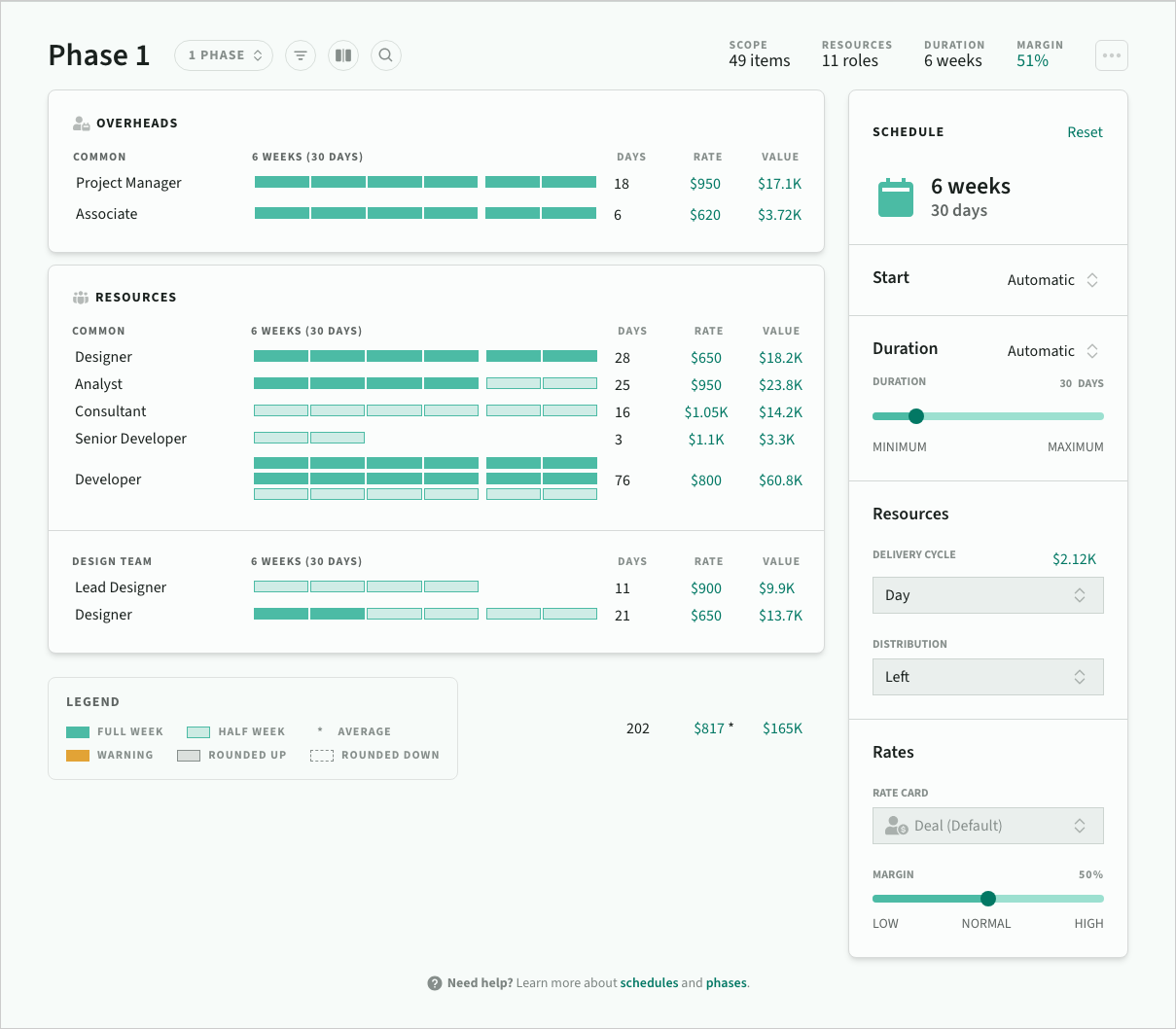 You can adjust the active rate card for the Phase from either the Scope or Schedule settings panel (they share the same rate card property). When you change the rate card or margin, the price and value of all roles will update automatically. Note that multiple rate cards is only available on Business and Enterprise plans.