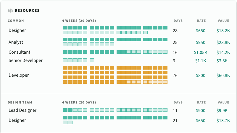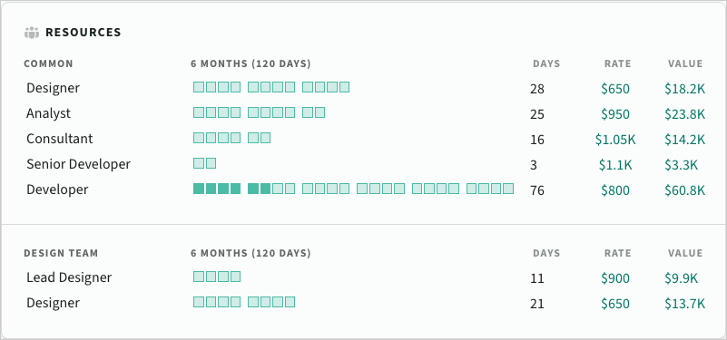 Each role contains a schedule plan based on the number of resources required to deliver the effort, as well as a summary of the total days, rate and value.