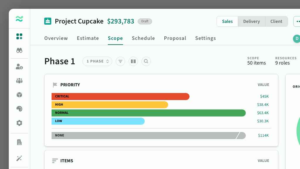 Scope is the subset of 'active' line items and estimates within a phase. It is used to analyse price drivers, and adjust overall scope/price.