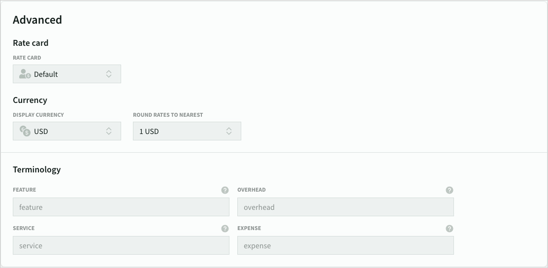 Advanced settings includes business plan features such as custom rate cards, deal currency and exchange rate
