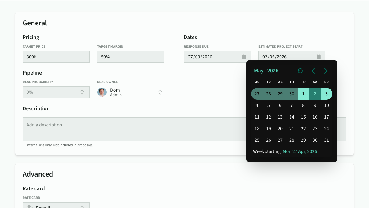 • Deal probability - set when updating status. Used for weighted pipeline revenue and capacity