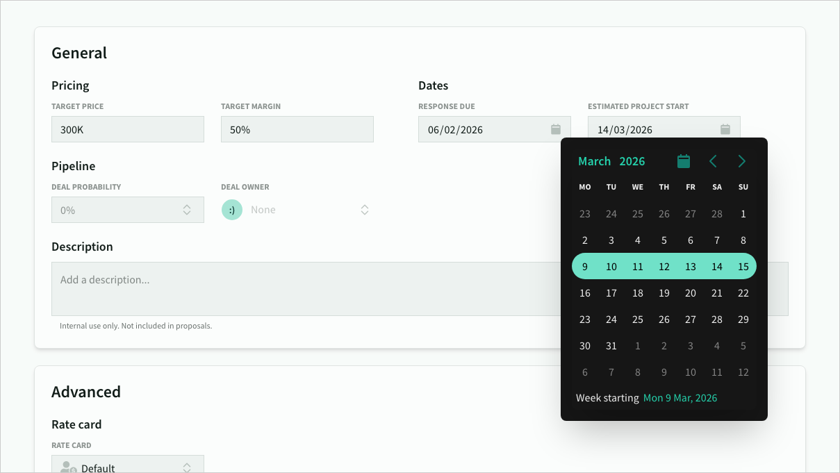 - Deal probability - set when updating status. Used for weighted pipeline revenue and capacity