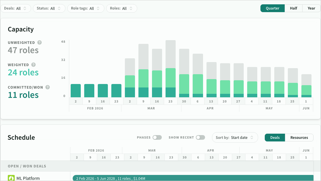 The capacity forecast displays resource projections weighted by deal probability. This chart can be filtered by deals, deal status, resource type, role tags, and timescale. This allows for more detailed analysis of pipeline impacts across your open and won deals.