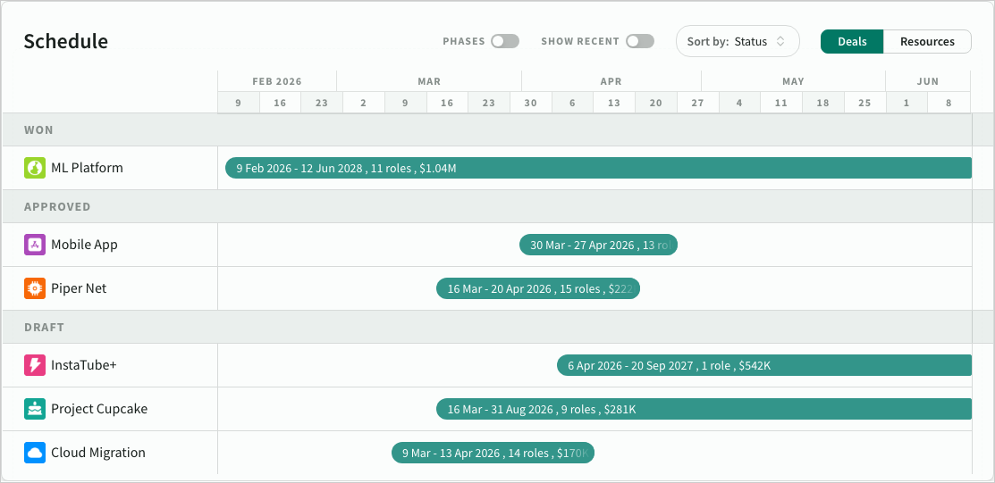 The schedule forecast presents a comprehensive view of all deal timelines, aligned with your chosen capacity filters.