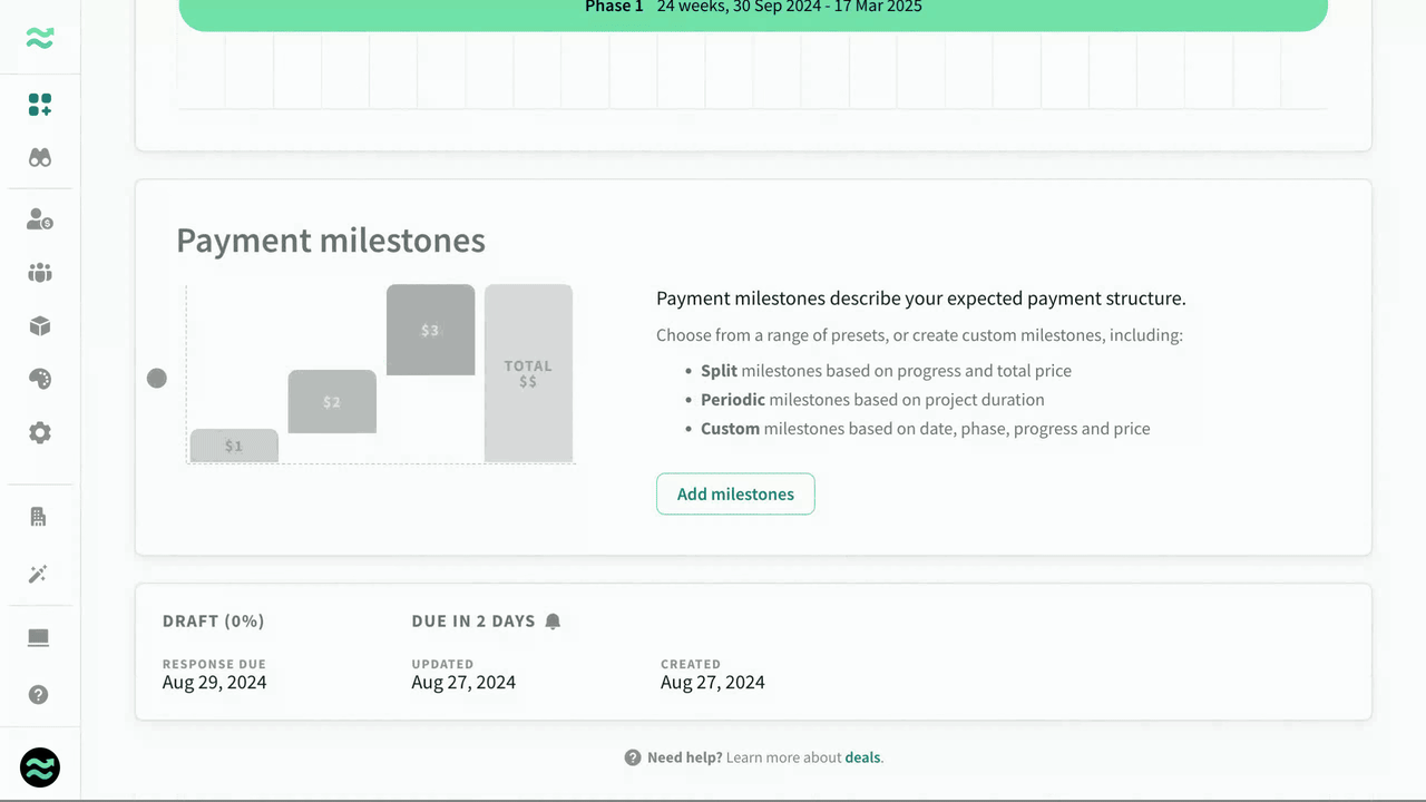 Payment milestones describe your expected payment structure based on deliverables, due dates and price.