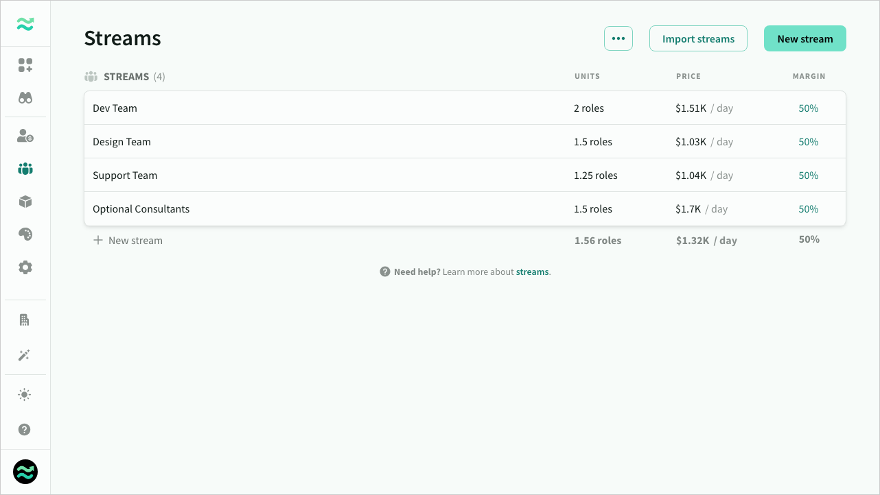 Streams are a simple, yet powerful concept in Estii that makes it easier to assign time (or a percentages of time) from multiple roles against a single estimate.