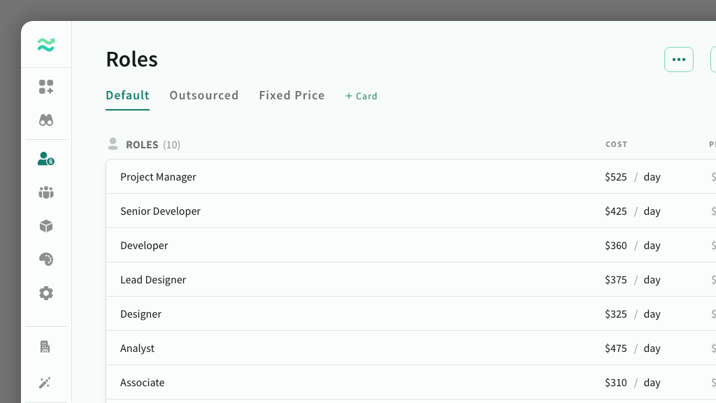 The default rate card contains the baseline cost and price for all roles in the space, along with a default margin and rate (hour, day, etc) for calculating prices.
