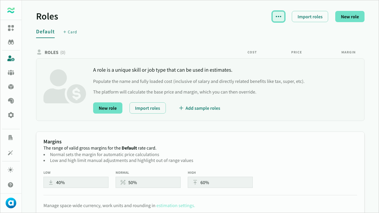Before you can create a proper deal, you should define a rate card. To access your rate card, either start the Roles tour in the Getting Started panel, or navigate to Roles in the main navigation.