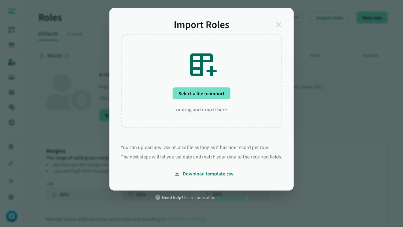 You can also import existing roles and rate cards from a csv file by clicking Import