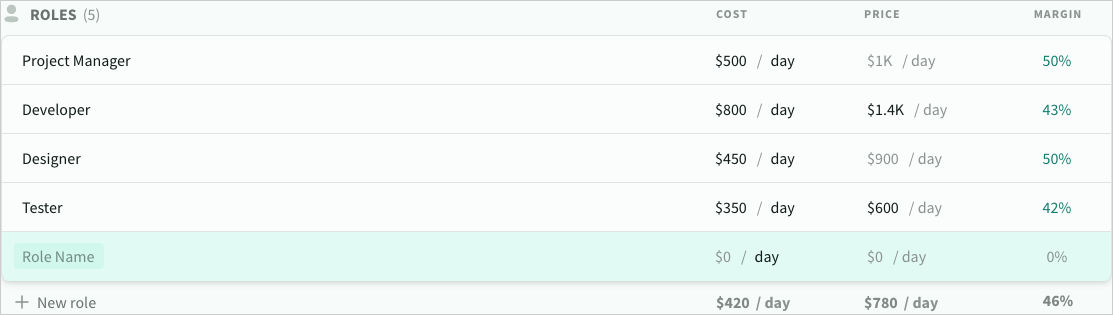 To add a role, click New role and enter the role name and cost per day (or other time period).
