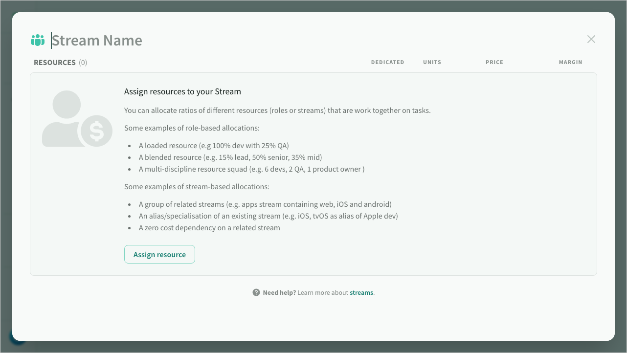 Streams allow you to define standard allocations or ratios of roles to use across deals. These can be used to create loaded resources or teams, or to define common deliverables or dependencies (like individual device types or platforms) .