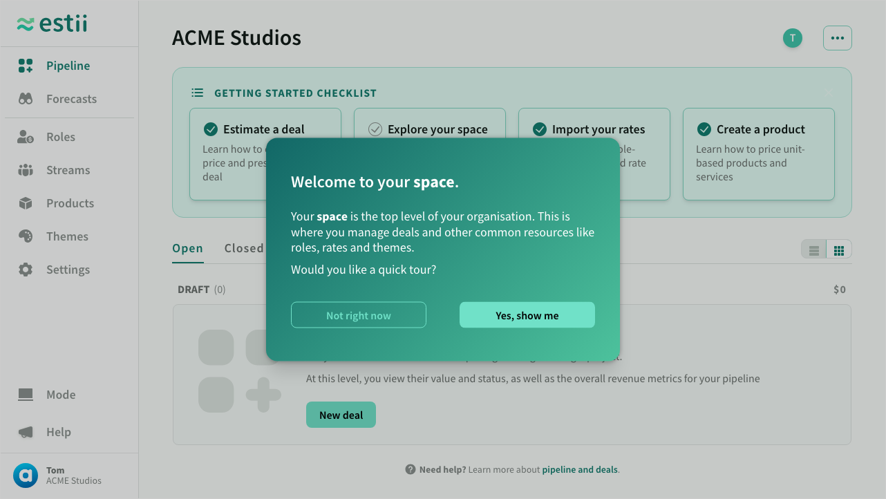 Once you’ve created your space, you will be redirected into your first deal, and given the option to take a quick introductory tour.
