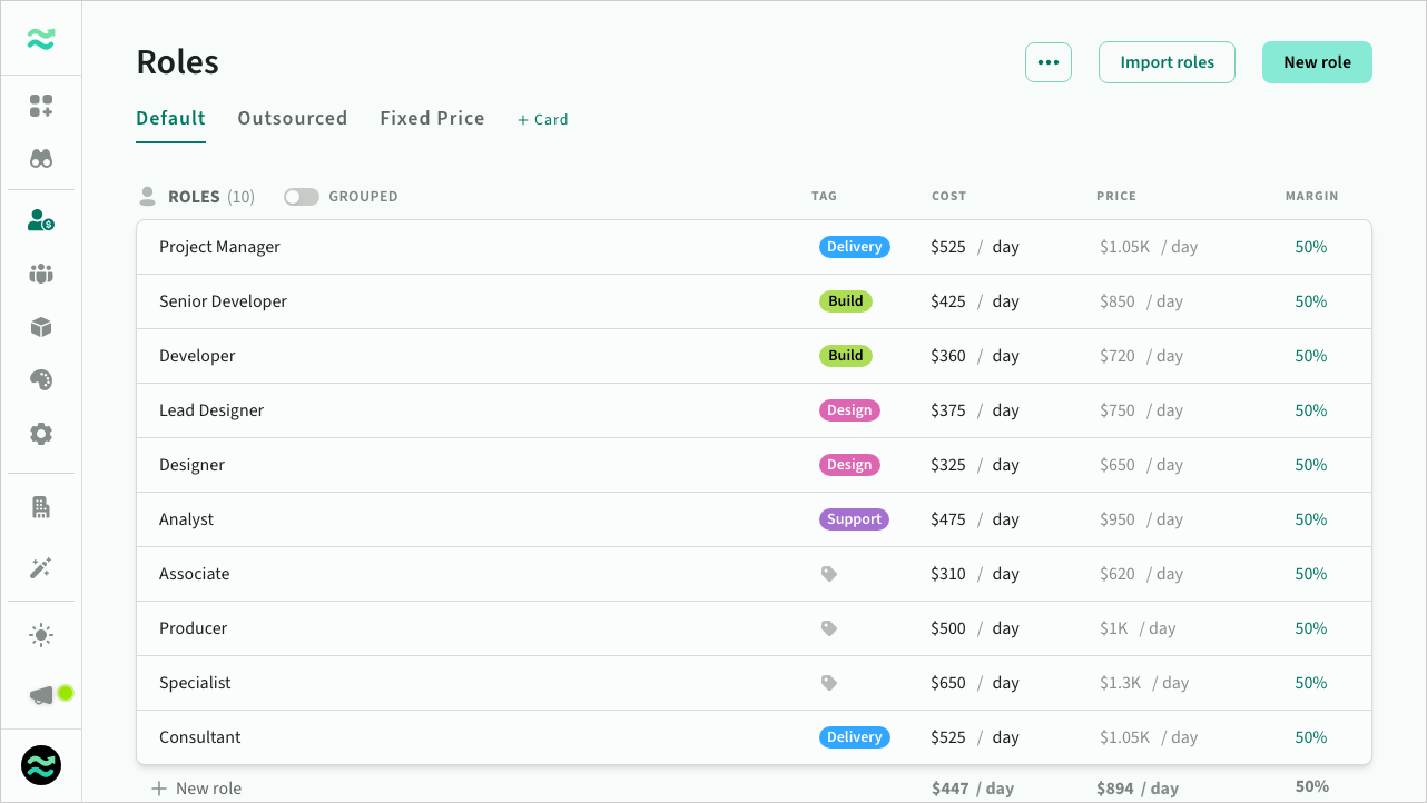 Before you create a deal, we recommend creating or importing some roles to your default rate card.