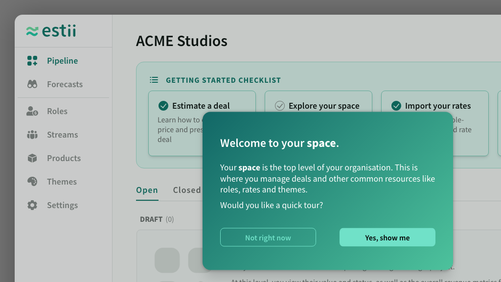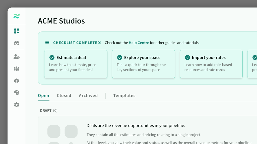 After creating a new space,, you will be directed into your first deal, and offered a short tour of the key features.