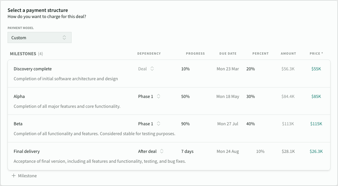 Edit the name, description, date and price for each milestones (as either fixed values or percentage of deal value/progress.