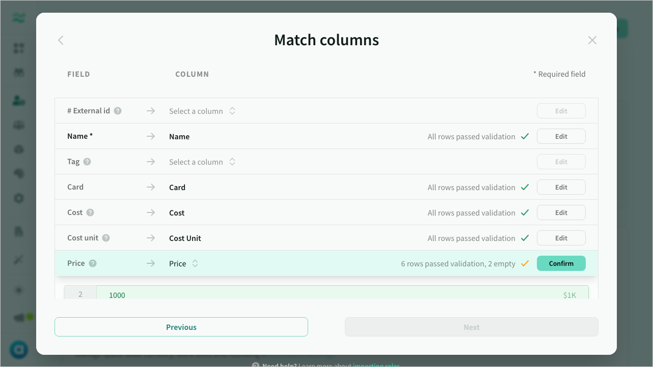 Match uploaded columns to required/optional fields, with inline preview.