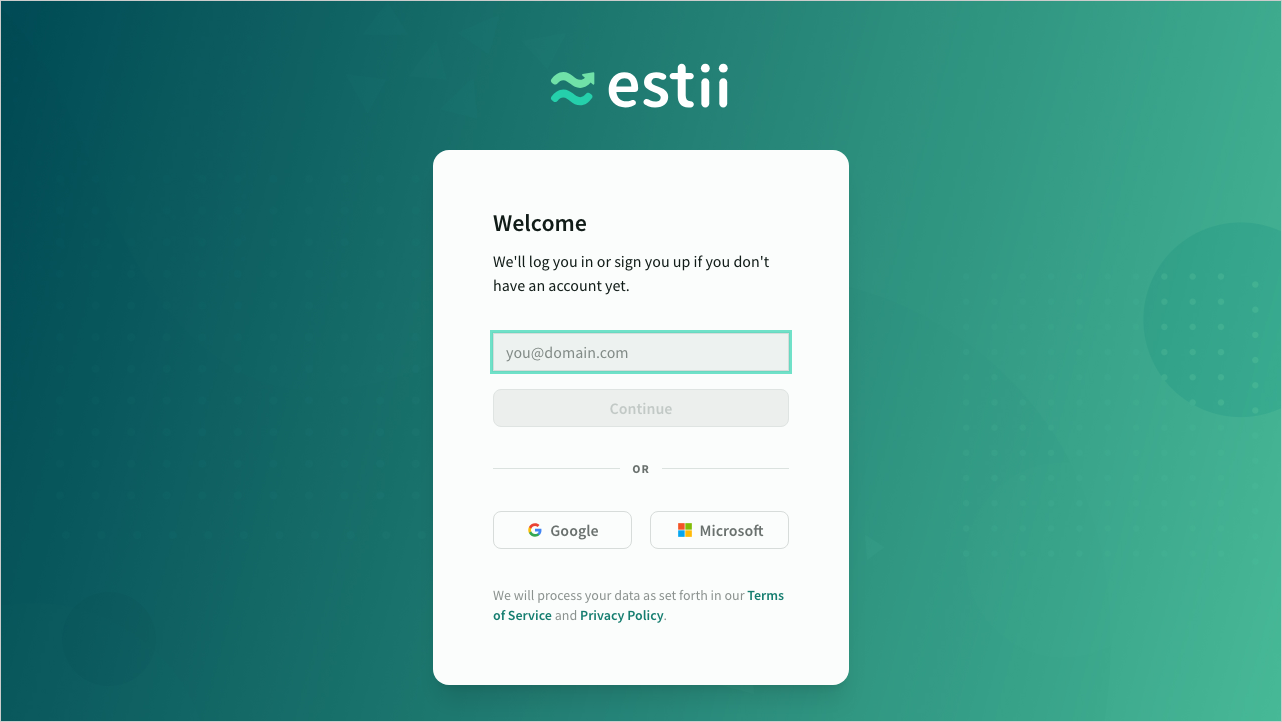 Estii offers multiple ways to log into a space. Sign in via SSO with an existing Google or Microsoft account, or configure an SSO integration
