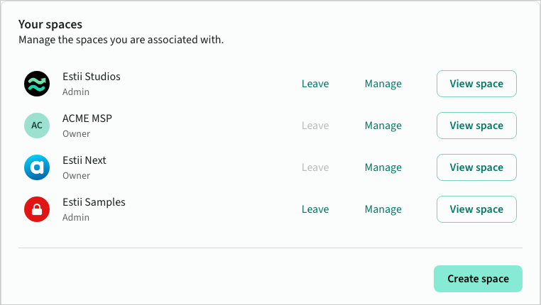 View or manage the spaces you are a part of, or create a new space. Non-owner members can leave a space from here — you'll be asked to confirm before being removed.